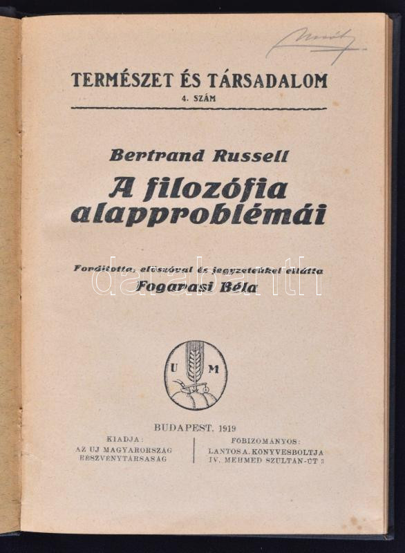 Bertrand Russell: A filozófia alapproblémái. Fordította, előszóval és jegyzettekkel ellátta: Fogarasi Béla. Természet és Társadalom 4. Budapest, 1919, Új Magyarország Részvénytársaság. Átkötött egészvászon, 132 p.