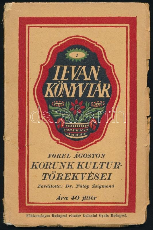 Leírás: Forel Ágoston: Korunk kulturtörekvései. Fordította: dr. Fülöp Zsigmond. Békéscsaba, 1912, Tevan. Kiadói papírkötésben. A borító szélei sérültek.