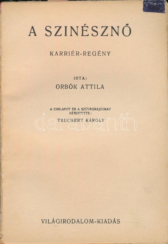 Orbók Attila: A színásznő. Karrier-regény. Teuchert Károly rajzaival. Bp.,é.n.,Világirodalom. Kiadói illusztrált papírkötés, a könyvtest elvált a borítótól és szétvált.