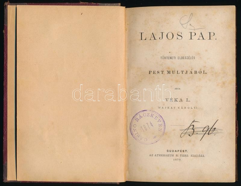 Véka L. (Vajkay Károly: Lajos Pap. Történeti elbeszélés Pest multjából. Bp., 1879., Athenaeum, 160 p. Átkötött félvászon-kötés, kopott borítóval, foxinfoltos lapokkal, "Casino Ráckeve 1874" bélyegzéssel.