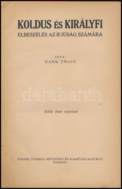 Mark Twain: Koldus és királyfi. Elbeszélés az ifjúság számára. Sebők I... https://www.darabanth.com/hu/377-Gyorsarveres/377.0/Konyvek/Konyvek-Mesekonyvek-ifjusagi-irodalom~500018/Mark-Twain-Koldus-es-kiralyfi-Elbeszeles-az-ifjusag-szamara-Sebok-Imre-rajzaival-Bp-e~II2187657