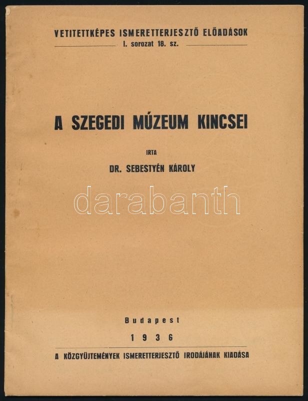 Sebestyén Károly: A szegedi múzeum kincsei. Vetítettképes Ismeretetterjesztő Előadások. I. sor. 18. sz. Bp., 1936., Közgyüjtemény Ismerettterjesztő Irodája, 28 p. Kiadói papírkötés, a hátsó borítón rajzzal.