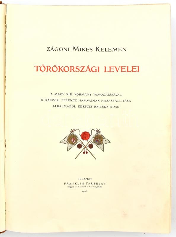 Zágoni Mikes Kelemen Törökországi Levelei. A Magy. Kir. Kormány támogatásával, II. Rákóczi Ferencz hamvainak hazaszállítása alkalmából készült emlékkiadás. Bp., 1906, Franklin, LXXX+233 p. + 39 (ebből 36 színes )+ 3 (kézirat-hasonmás) t. Bevezető tanulmányokat írták: Négyesy László-Thaly Kálmán-Beöthy Zsolt-Szily Kálmán-Erődi Béla. A leveleket az eredeti kézirat alapján kiadja: Miklós Ferenc. A díszítéseket rajzolta Edvi Illés Aladár. Gazdag képanyaggal illusztrált. Kiadói bordázott gerincű aranyozott egészbőr kötésben, az első kötéstáblán aranyozott, dombornyomású címerrel, felül aranyozott lapélekkel, és dombornyomású díszítésekkel, képekkel gazdagon illusztrált, kopott borítóval, sérült gerinccel.