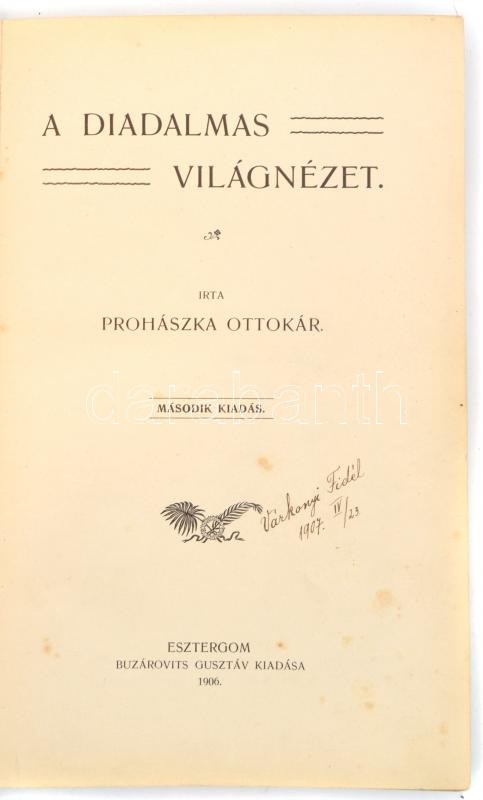Prohászka Ottokár: A diadalmas világnézet. Esztergom, 1906 Buzárovits Gusztáv, XII+291+1 p. Második kiadás. Korabeli aranyozott gerincű kopott félvászon-kötés, márványozott lapélekkel.