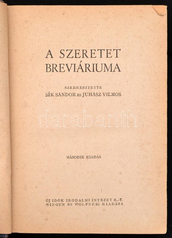 A szeretet breviáriuma. Szerk.: Sík Sándor, Juhász Vilmos. Második kiadás. Bp, Singer és Wolfner. Átkötött félvászon-kötésben.