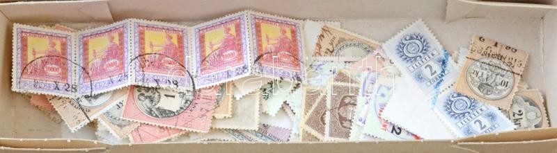 Leírás: kb 300 db vegyes magyar okmánybélyeg, dobozban ömlesztve