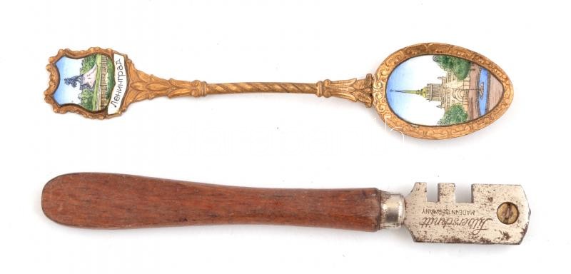 Leírás: Leningrad emlékkanál és Silberschnitt üvegvágó, enyhén kopottas állapotban h: 13 és 13,5 cm