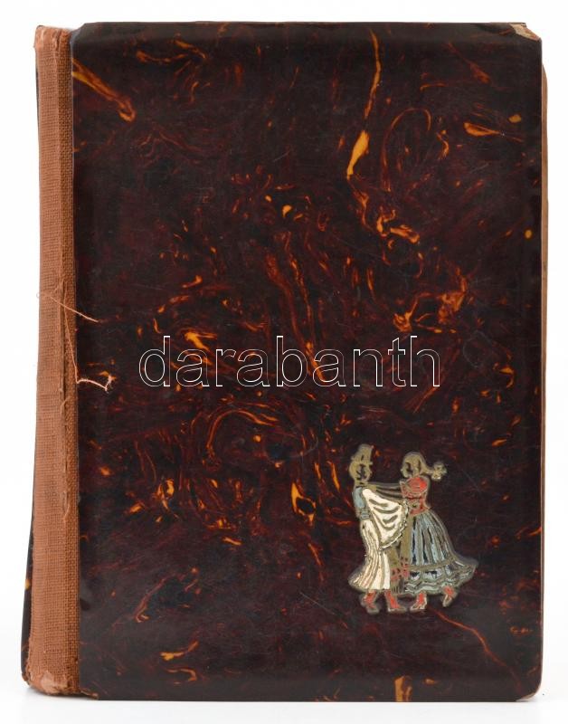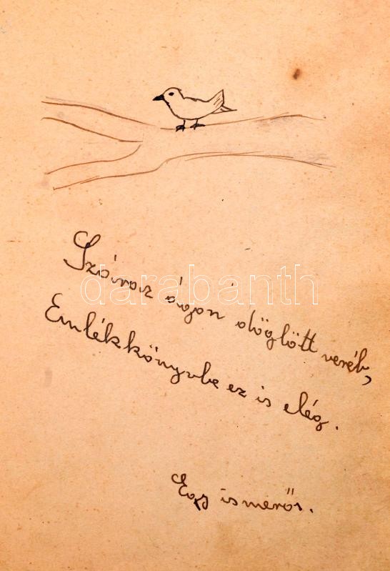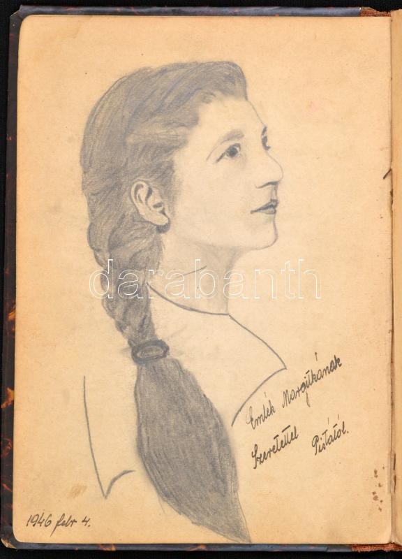 Leírás: cca 1942-1949 Régi emlékkönyv bejegyzésekkel, rajzokkal, kopottas félvászon kötésben