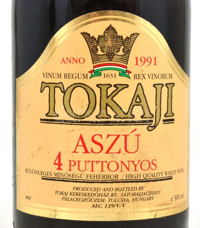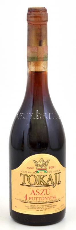 1991 Tokaji Aszú 4 puttonyos, Tokaj Kereskedőház Rt., Tolcsva, 0,5 l. https://www.darabanth.com/hu/377-Gyorsarveres/377.0/Mutargy-papirregiseg-egyeb/Muzealis-borok-italok~15/1991-Tokaji-Aszu-4-puttonyos-Tokaj-Kereskedohaz-Rt-Tolcsva-0-5-l~II2197478