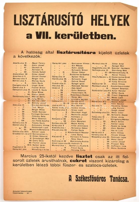 1917 Lisztárusító helyek a VII. kerületben 32x47 cm https://www.darabanth.com/hu/377-Gyorsarveres/377.0/Mutargy-papirregiseg-egyeb/Nyomtatvanyok~32/1917-Lisztarusito-helyek-a-VII-keruletben-32x47-cm~II2223244