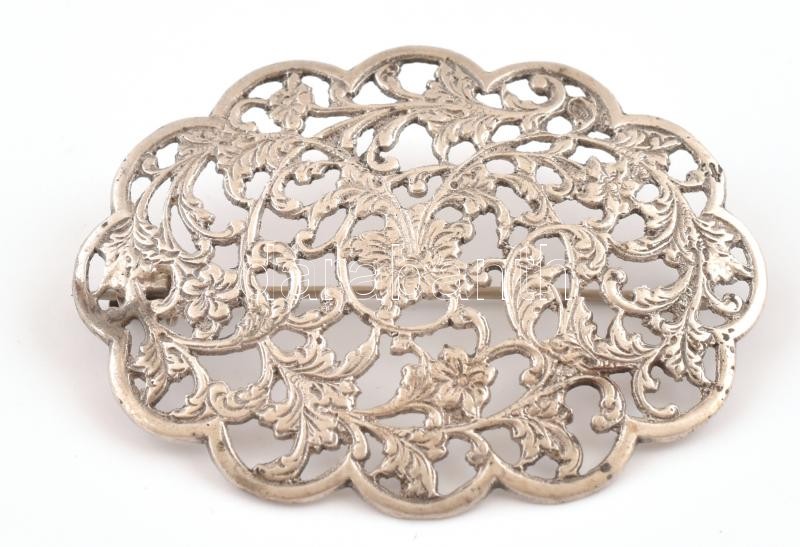 Leírás: Ezüst(Ag) virágmintás bross, fém tűvel, jelzés nélkül, 6×4,5 cm, bruttó: 10,58 g