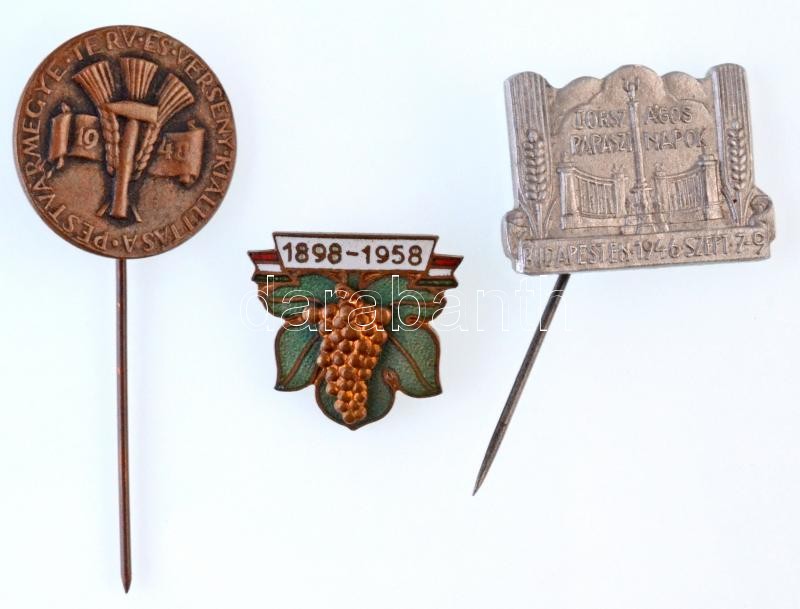 Leírás: 1946. "I. Országos Parasztnapok" Al jelvény (a tű mozog) + 1948. "Pestvármegye Terv- és Versenykiállítása" Br jelvény + 1958. "1898-1958. Szőlészeti jubileum" zománcozott jelvény T:1-2
