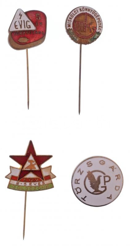 ~1950-1970. "Fővárosi 12. Építő Vállalat 2-5 éves dolgozónk, EVIG (Egyesült Villamos Gépgyár) 5 éves, Miskolci Könnyűgépgyár 10 éves, Graboplast Győri Pamutszövő- és Műbőrgyár arany fokozatú" törzsgárda jelvények (4xklf) T:1