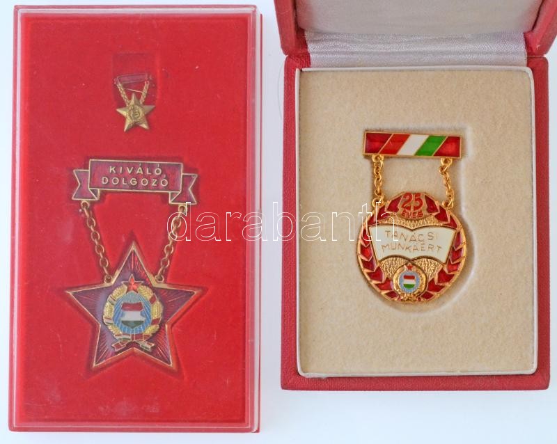 Leírás: ~1970. "25 éves Tanácsi Munkáért" zománcozott fém kitüntető jelvény eredeti tokban + ~1970. "Kiváló Dolgozó" kitüntetés miniatűrrel, eredeti tokban T:1
