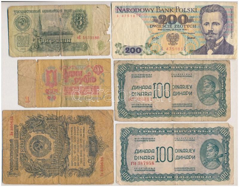 Leírás: Vegyes: Jugoszlávia 1944. 100D (2x) + Szovjetunió 1947. 1R + 1961. 1R + 1961. 3R + Lengyelország 1976. 200Zl T:III