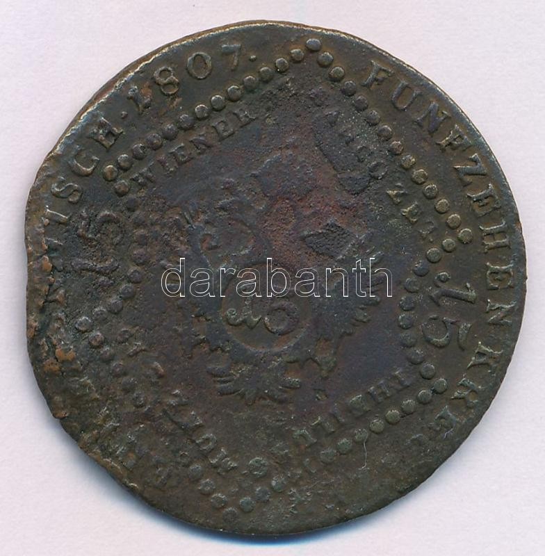 Ausztria 1807A 15kr Cu "I. Ferenc" T:2-,3 hajlott lemez, pat... https://www.darabanth.com/hu/377-Gyorsarveres/377.0/Numizmatika/Kulfoldi-fem-es-ezustpenzek~1500014/Ausztria-1807A-15kr-Cu-I-Ferenc-T2-3-hajlott-lemez-patina-ph--Austria-1807A-15-Kreuzer-Cu-~II2198659
