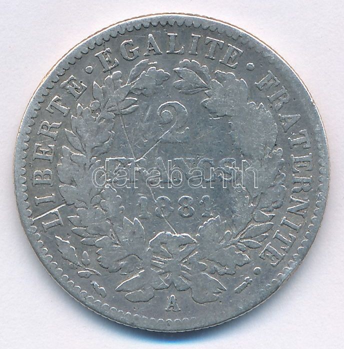 France 1881A 2 Francs Ag C:VF sc... https://www.darabanth.com/hu/377-Gyorsarveres/377.0/Numizmatika/Kulfoldi-fem-es-ezustpenzek~1500014/Franciaorszag-1881A-2Fr-Ag-T2-karc-France-1881A-2-Francs-Ag-CVF-scratch-Krause-KM238171~II2139890
