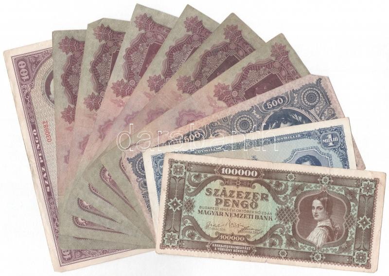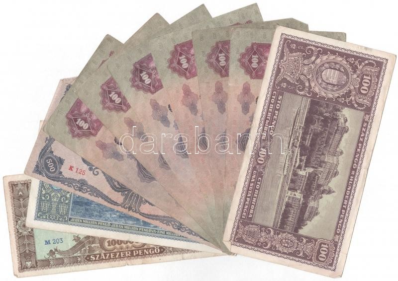 1930. 100P (6x) + 1945. 100P + 500P + 100.000P + 1.000.000P T:III,III- https://www.darabanth.com/hu/377-Gyorsarveres/377.0/Numizmatika/Magyar-bankjegyek~1500007/1930-100P-6x-plus-1945-100P-plus-500P-plus-100000P-plus-1000000P-TIII-III-~II2193418