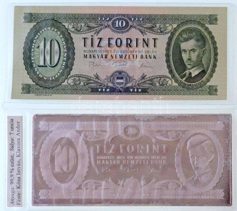 Leírás: 1975. 10Ft Ag bankjegyveret (217,7g/7 uncia/0.999/154x70mm) + 1975. 10Ft T:1 (eredetileg PP),I kis patina
