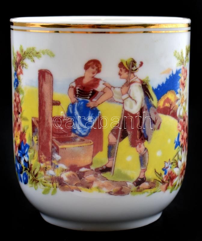 Leírás: Porcelán bögre tiroli jelenettel, matricás, jelzés nélkül, kopásnyomokkal, m: 9,5 cm