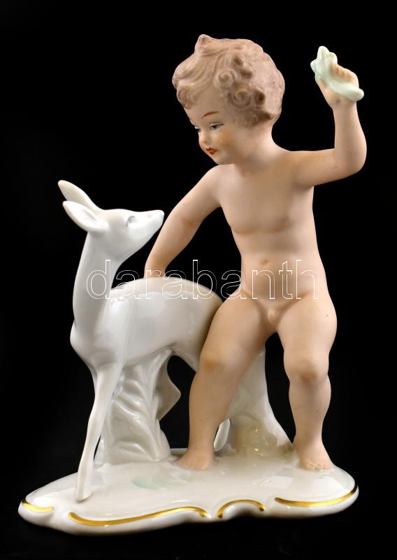 Leírás: Wallendorf porcelán puttó őzikével, kézzel festett, jelzett, kis kopásnyomokkal, m: 16,5 cm