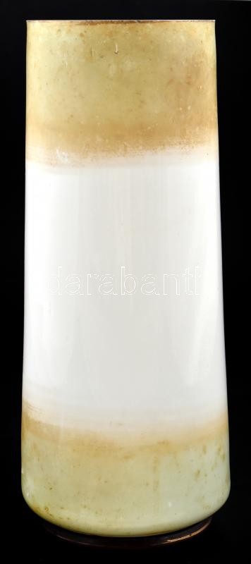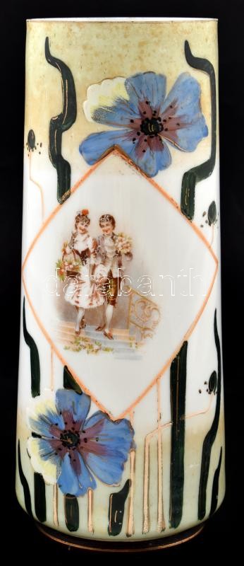 Leírás: Tejüveg váza, barokk jelenettel, részben kézzel festett, kopásnyomokkal, m: 27,5 cm