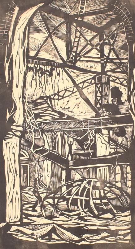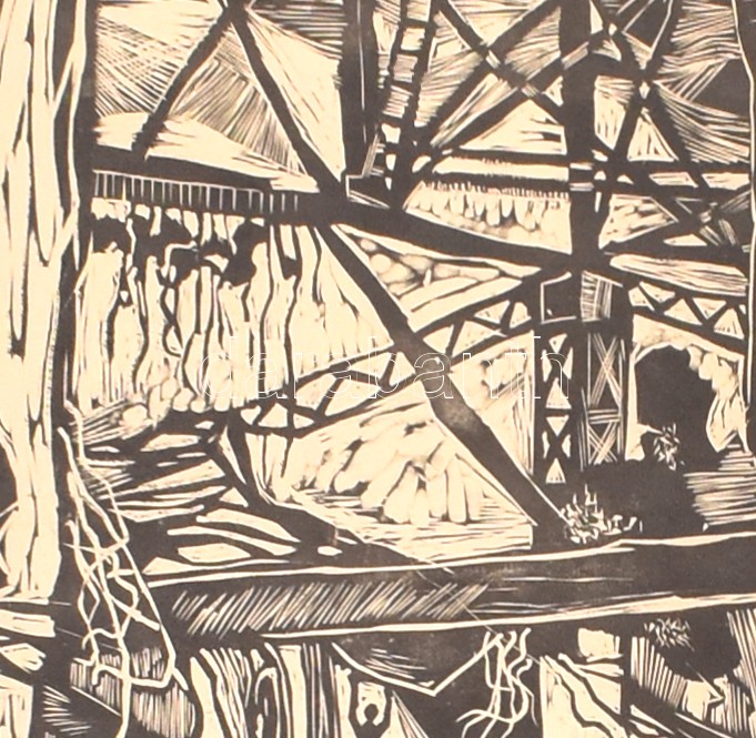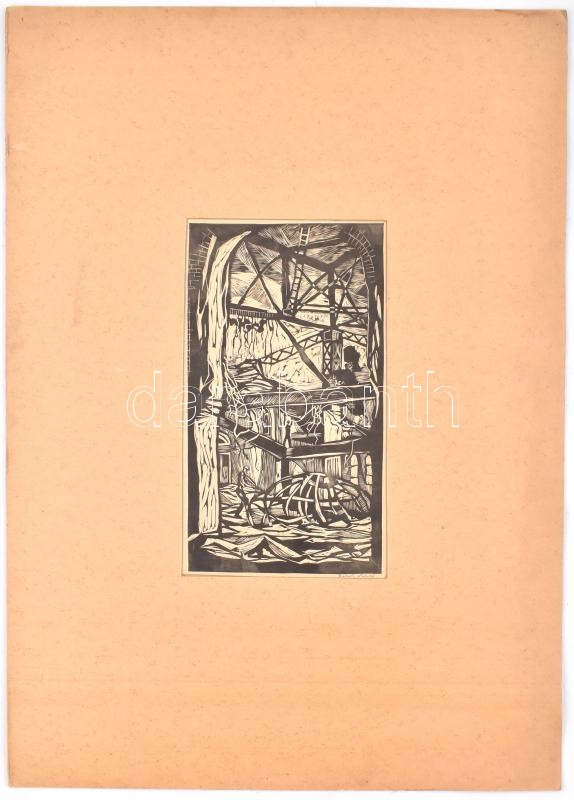 Leírás: Balogh László (1930-): Eger épületbontás . Linómetszet, papír, jelzett, 35x18 cm paszpartuban.