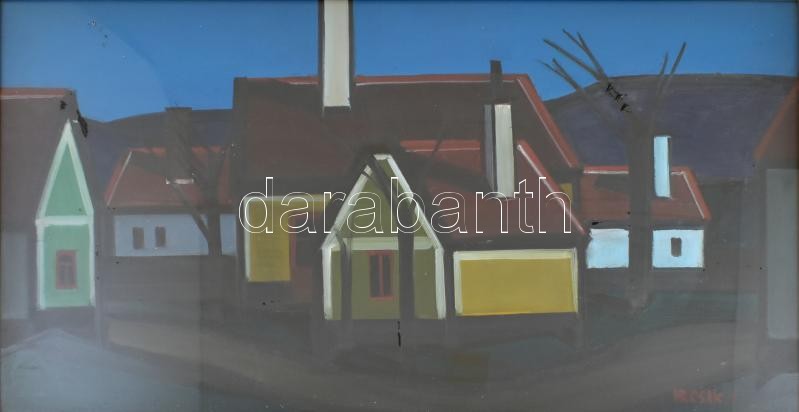 Ircsik József (1932-1986): Házak. Olaj, farost, jelzett. Hátoldalán autográf felirattal és Képcsarnok Vállalat címkéjével. Üvegezett fa keretben, 45×76 cm