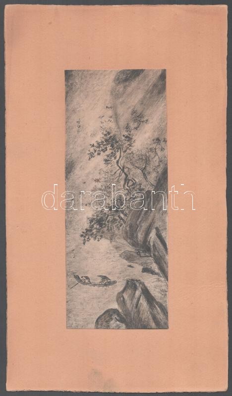 Ismeretlen jelzéssel, feltehetően Wu I-hsien kínai alkotó XV. sz. műve utáni XX. sz. másolat: Zivatar. Tus, ceruza, papír, lap teteje kartonra kasírozva. Hátoldalán feliratozott. 22×9 cm