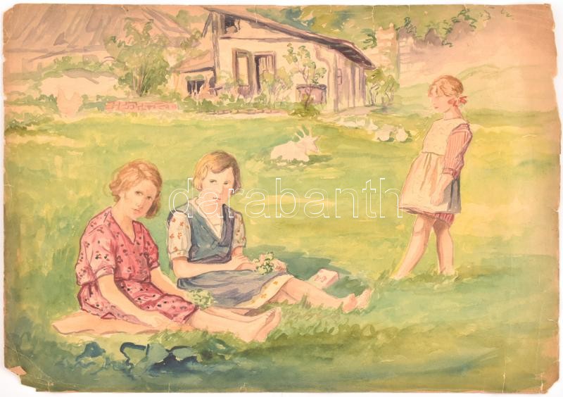 Jelzés nélkül: Lányok az udvaron. Akvarell, papír, sérült, 29,5x42 cm https://www.darabanth.com/hu/378-Gyorsarveres/378.0/Festmenyek-es-grafikak/Festmenyek-es-grafikak~500001/Jelzes-nelkul-Lanyok-az-udvaron-Akvarell-papir-serult-29-5x42-cm~II2230827