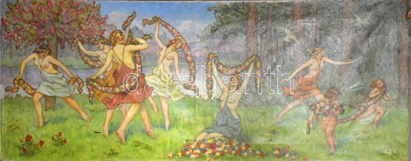 Jelzés nélkül: Örömtánc. Olaj, vászon, sérült, restaurált, 60x150 cm https://www.darabanth.com/hu/378-Gyorsarveres/378.0/Festmenyek-es-grafikak/Festmenyek-es-grafikak~500001/Jelzes-nelkul-Oromtanc-Olaj-vaszon-serult-restauralt-60x150-cm~II2233083