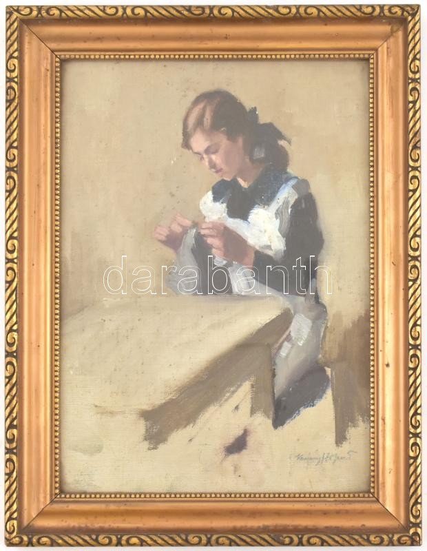 Keményffy Jenő (1875-1920): Varró lány. Olaj, vászon. Üvegezett fa keretben. Hátoldalán ajándékozási sorokkal, Balázs József tollából, 1938-ból. 34x25 cm.