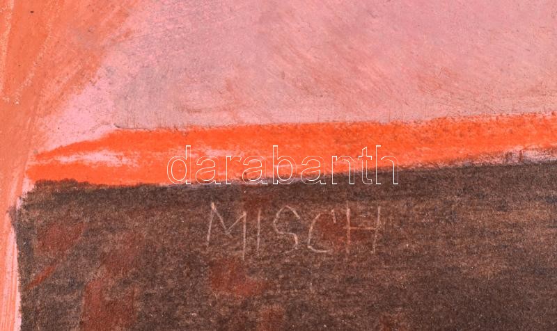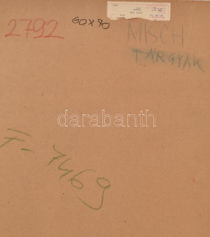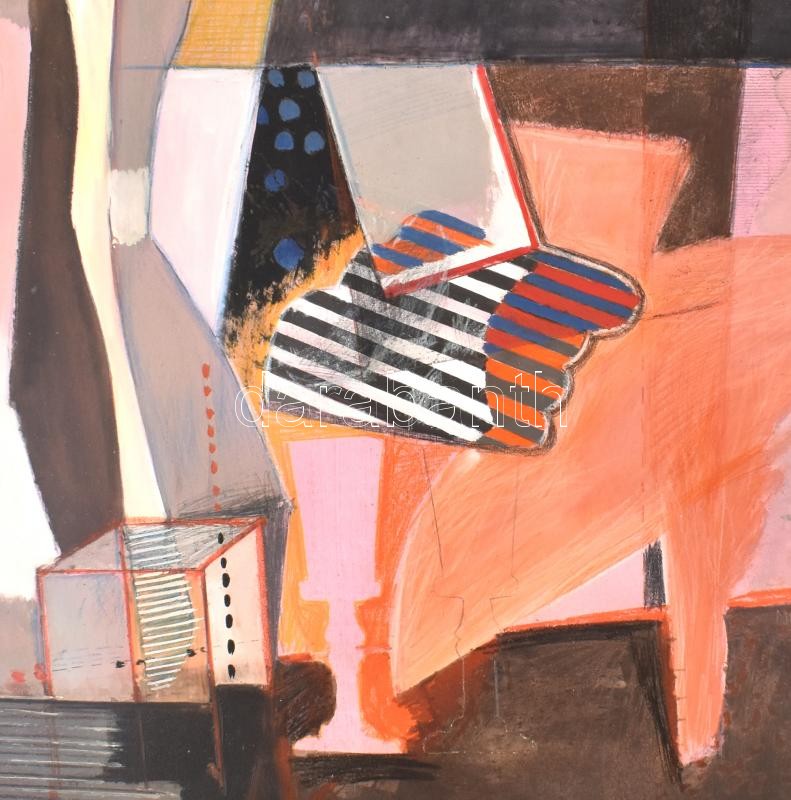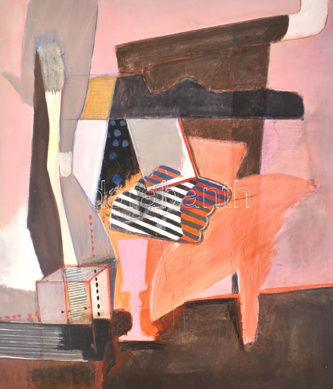Misch Ádám (1935-1995): Tárgyak (konstruktivista kompozíció). Olaj, kréta, ceruza, farost, jelzett (Misch), hátoldalán is jelzett és Képcsarnok Vállalat címkéjével. 1978-79 körül. 70×60 cm.