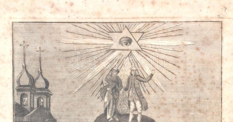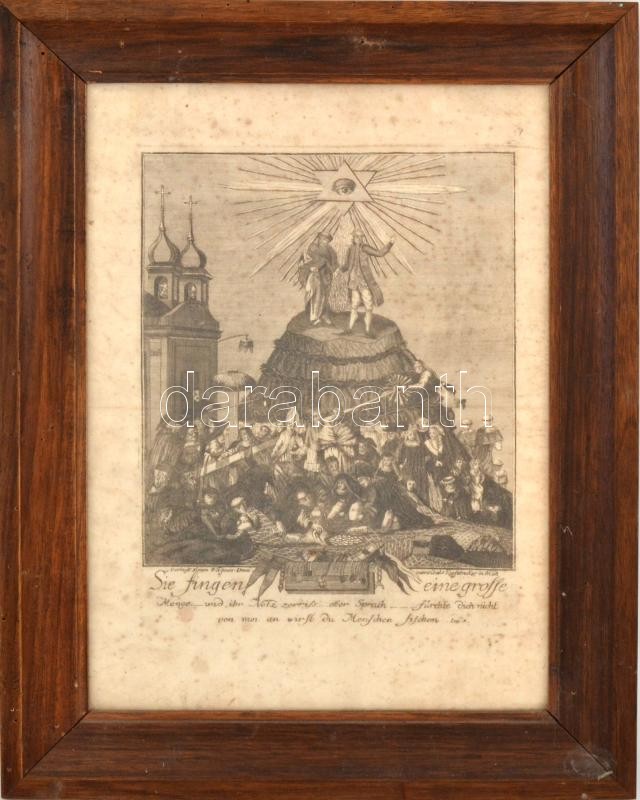 Sie fingen eine grosse Menge und ihr netz zerriss..., II. József reformjának allegóriája: harc a katolikus papság ellen, benne szabadkőműves jelképpel, rézmetszet, foltos üvegezett fa keretben, 28x20 cm, keret: 34x44 cm / Etching, allegory of the reform of Joseph II. regarding the catholic church, with freemason symbol. Etching spotty, framed under glass. 28x20 cm
