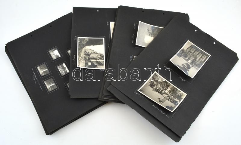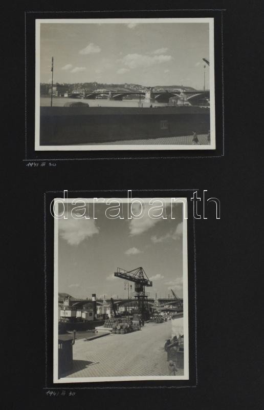 1938-1942 Budapest életképek albumlapokon, felvonulás, jégzajlás, árvíz, hidak, terek, épületek, gazdag gyűjtemény, 85 db fotó, 33 db karton albumlapokon, egy fotó sarkán törésnyommal, kissé sérült albumlapokkal, de egyébként a fotók nagyrészt jó állapotban, 22x16 cm és 3x4 cm közötti méretben