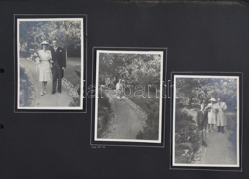 1938-1942 Különféle életképek albumlapokon,kb. 70 db fotó 31 db albumlapon, rajta különféle helyszÃnekkel, Vác, Nagybörzsöny, Római fürdÅ‘, Dunakeszi, Lakberendezési vásár, Nagytétény, Klotildliget, esküvÅ‘i fotók...stb, az egyik fotó sarkán hiánnyal, sérült kartonlapokkal, 11x8 cm és 8x5 cm közötti méretben