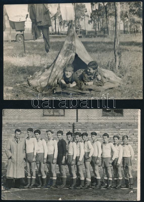 1955-1960 2 db fotó (1955 Bp., Vörös Lobogó Kölyök Torna III. helyezett, futball csapat; 1960 Fonyód-Bélatelep Jamboree), felületükön törésnyomokkal, sérültek, 11x17 cm és 12x18 cm