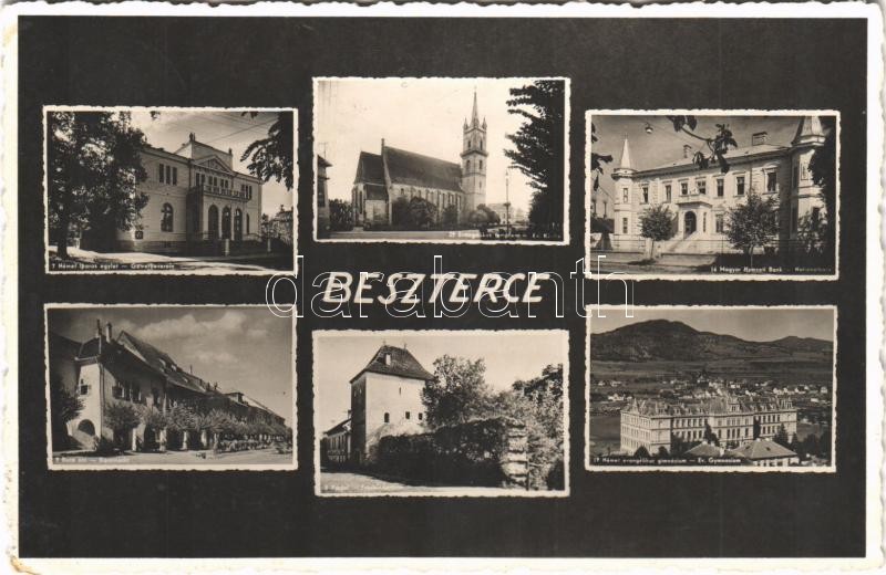 1942 Beszterce, Bistritz, Bistrita; Magyar Iparos Egylet, Evangélikus templom, Magyar Nemzeti Bank, Búza sor, Várfal, Német evangélikus gimnázium / trade association, Lutheran church and high school, national bank, castle wall, street view (kopott sarok / worn corner)