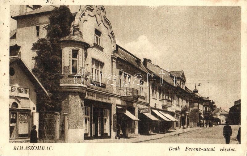 Leírás: Rimaszombat, Rimavská Sobota; Deák Ferenc utca, Hitelintézet, üzletek, drogéria (gyógyszertár) / street view, bank, shops, drugstore, pharmacy (fa)