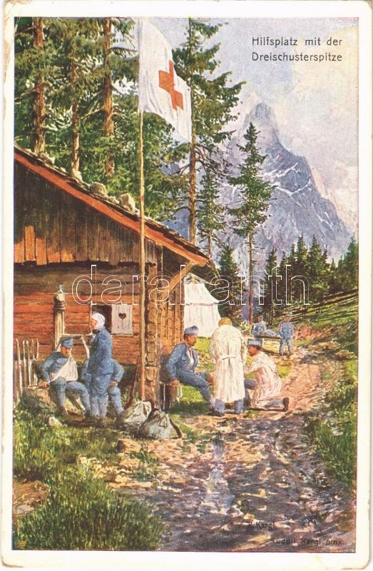 Hilfsplatz mit der Dreischusterspitze / WWI Austro-Hungarian military art postcard. Offizielle Karte für Rotes Kreuz, Kriegsfürsorgeamt Kriegshilfsbüro Nr. 215. s: Rudolf Kargl (EK)