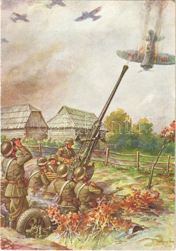 Marton Ferenc szakaszvezető gépágyújára támadó öt ellenséges repülőgéppel is szembeszállva egyet lelőtt, a többit pedig menekülésre késztette / WWII Hungarian Military Officer Ferenc Marton fighting aeroplanes with anti-aircraft gun s: Helbing Ferenc