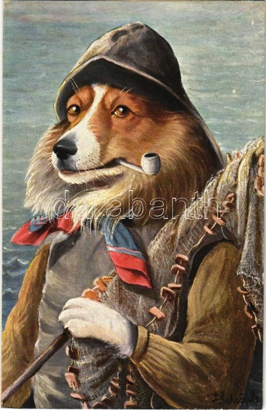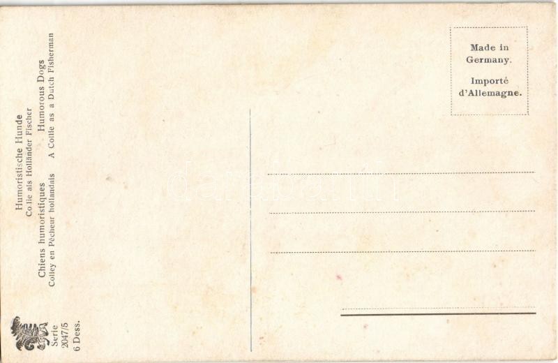 Leírás: Humoristische Hunde. Collie als Holländer Fischer / A Collie dog in as a Dutch fisherman. Serie 2047/5. 6. Dess. s: Schröpler (r)