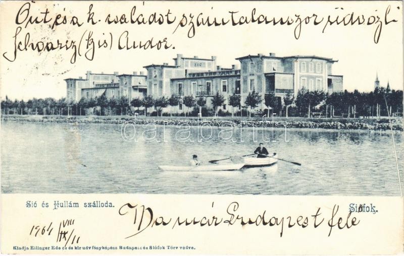 Leírás: 1904 Siófok, Sió és Hullám szálloda, csónakázók. Zsidó Schwarcz (kis) Andor és családja üdvözlete (Magyar zsidó üdülővárosként szokták nevezni)