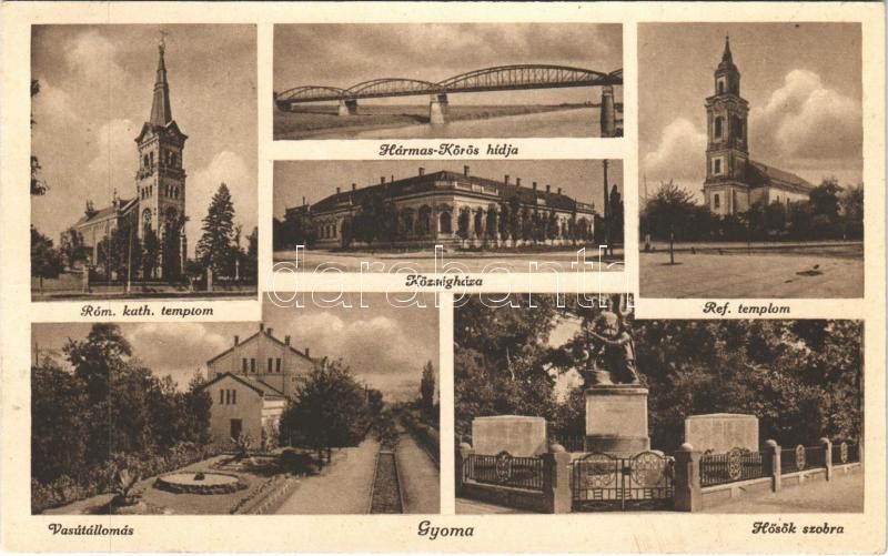 Leírás: Gyoma, Római katolikus templom, Hármas-Körös hídja, Községháza, Református templom, Vasútállomás, Hősök szobra, emlékmű