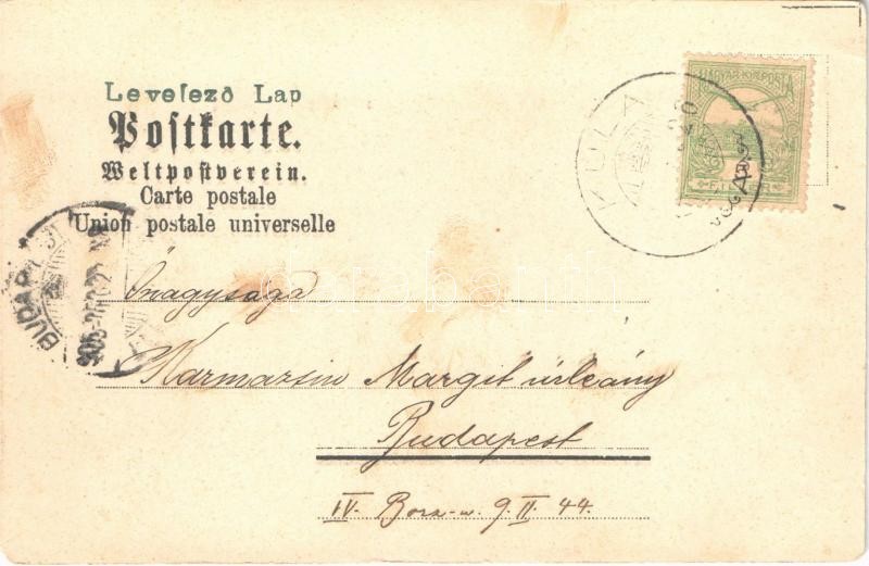Leírás: 1905 Kula, Zöldkert, vendéglő, üzlet. Franz Kugler kiadása. Szecessziós litho keret madarakkal / restaurant, inn, shop. Art Nouveau litho frame with birds (kopott sarok / worn corner)