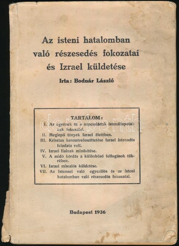 Bodnár László: Az isteni hatalomban való részesedés fokozatai és Izrael küldetése. Bp.,1936., (Neuwald Illés-ny.) Kiadói papírkötés, sérült gerinccel, foltos.