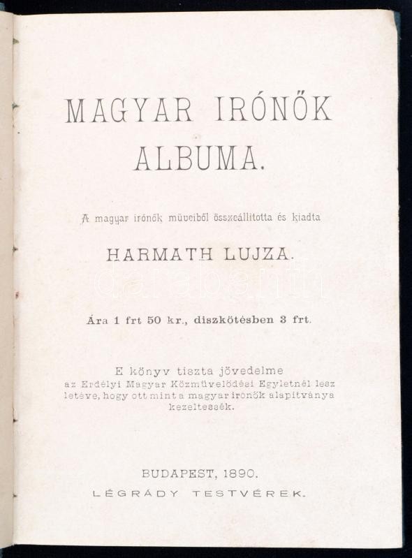 Magyar írónők albuma. A magyar írónők műveiből összeállította és kiadta: Harmath Lujza. Bp., 1890., Légrády, XV+356 p. Átkötött kopott félvászon-kötésben.