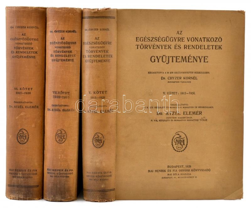 Az egészségügyre vonatkozó törvények és rendeletek gyűjteménye. V., VI. VII. kötet: 1913-1926, 1927-1928. 1929-1933 Megindította Dr. Chyzer Kornél. Szerk.: Dr. Atzél Elemér. Bp., 1929-35, Mai Henrik és Fia Orvosi Könyvkiadó. Kiadói egészvászon-kötés,. Mai Henrik (1816-1906) (Mai Manó (1855-1917) fotós apja) orvosdoktor, főreáliskolai tanár, orvosi antikvárium és könyvkiadó alapítója. Később fia Ignác, majd unokája Béla vitte tovább az üzletet. A kiadó 1920-as években főleg magyar szerzők pszichiátriai munkáit adta ki. 'Józsa Sándor "Arany kalász" Gyógyszertára. Kunhegyes' bebélyegzéssel. Józsa Sándor (1902-1980) által vezetett (1930-1950) jó nevű és ismert "Arany kalász" patika bélyegzőjével. Ritka!