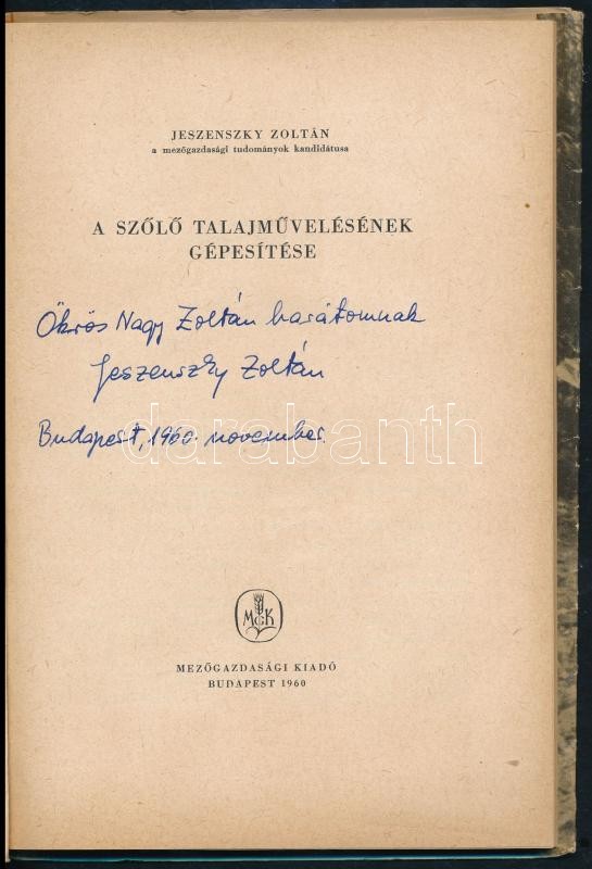 Leírás: Jeszenszky Zoltán: A szőlő talajművelésének gépesítése. Bp.,1960, Mezőgazdasági Kiadó. Kiadói papírkötés. A szerző által dedikált.