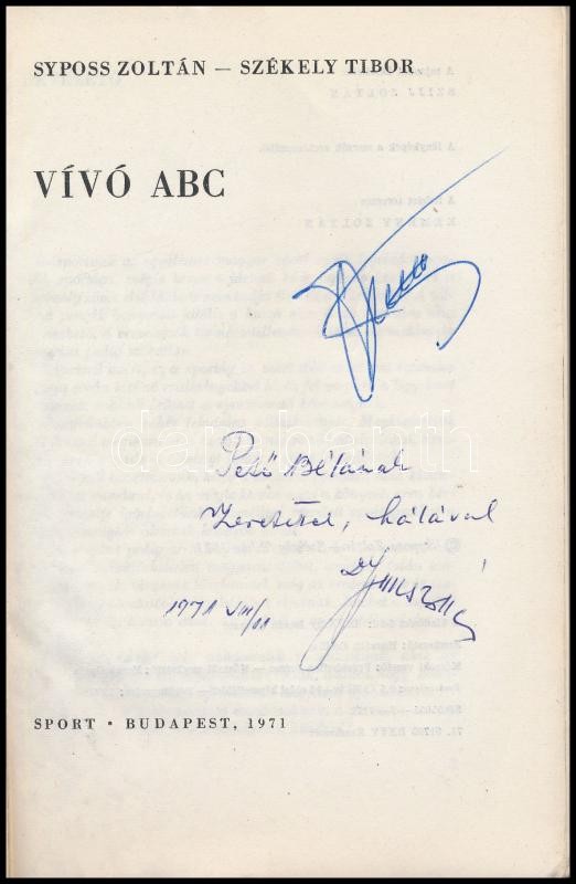 Syposs Zoltán, Székely Tibor: Vívó ABC. Bp., 1971, Sport. Példányszám: 1200. DEDIKÁLT! Fekete-fehér képekkel illusztrált. Egy kihajtható táblával (a magyar vívók legjobb eredményei a nagy világversenyeken)l Kiadói papírkötés.